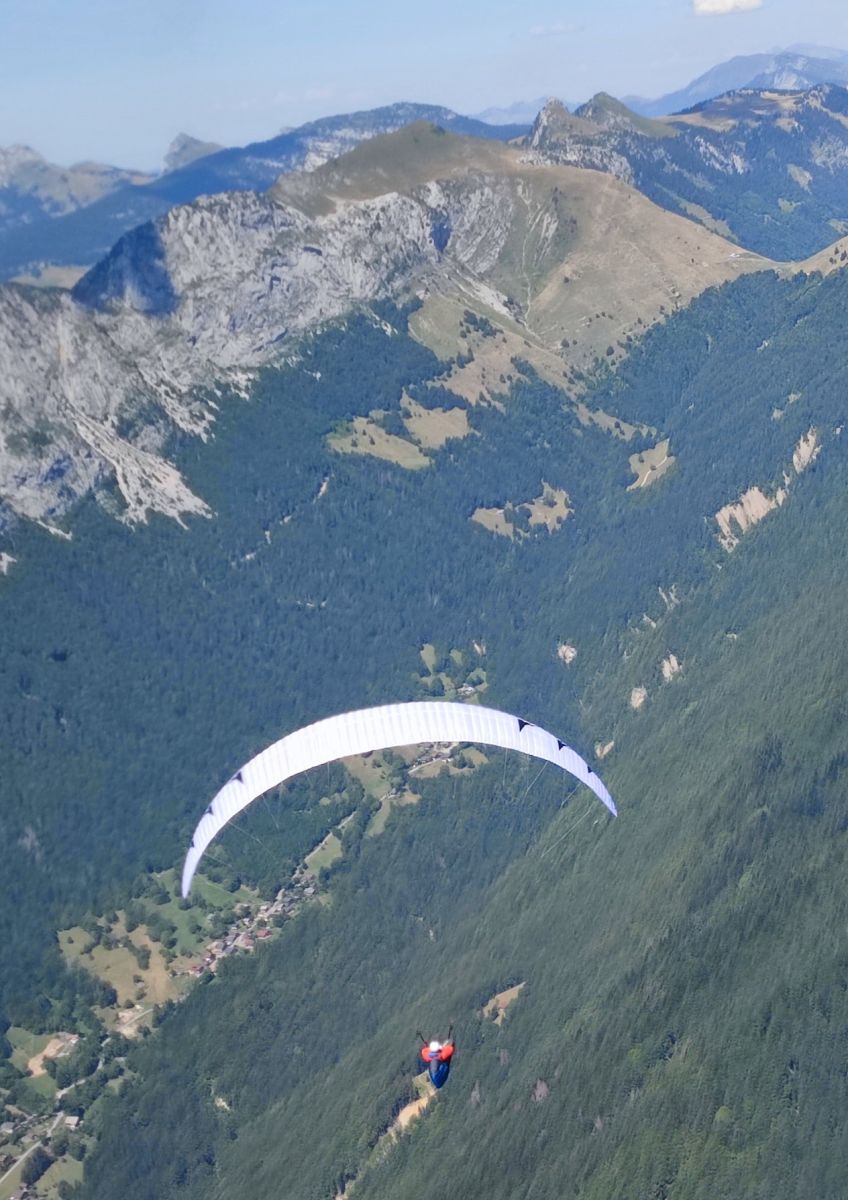 Le virage de la Scala2 est assez intuitif. La combinaison roulis/lacet est bien équilibrée, il y a moins de roulis que sur la version 1. A 80Kg les bouts d’aile sont moins tendus que sur une Volt 4 de même taille par exemple, ils informent lorsque la masse d’air devient turbulente. Le pilote devra alors avoir un peu d’autorité à la commande, mais c’est une qualité dans la recherche d’un pilotage actif précis. La combinaison avec ma Range Air Xalp donne un ensemble maniable et joueur. Sous ma Sock j’étais dans une version plus stable mais efficace. Des vols en compagnie de Volt 4, Artik R, Alpina 4 m’ont démontré une belle qualité de montée en thermique de cette Scala2. C’est à mon sens un vrai point fort.