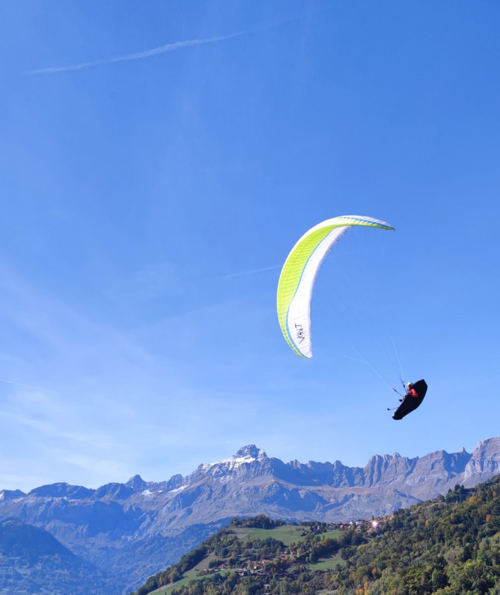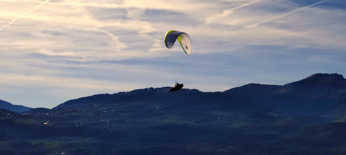Le virage est très agréable et homogène, l’aile répond avec précision et douceur en gardant un très bon maintien de courbe dans l’ascendance, sans dérapage intempestif. Bien que l’aile soit légère on ne constate pas de retour d’information démesuré y compris dans une masse d’air agitée. Ce filtrage va laisser au pilote une sérénité et une disponibilité d’attention profitables à sa performance. J’ai trouvé cela assez similaire au ressenti éprouvé sous la Fusion, avec plus de solidité que les bouts d’ailes de l’Explorer2. La montée en thermique est très bonne, avec une vraie capacité du bout d’aile à vous tirer vers le cœur. Elle est au moins aussi efficace que sous la Gin, que je considère à ce titre comme une très bonne voile.